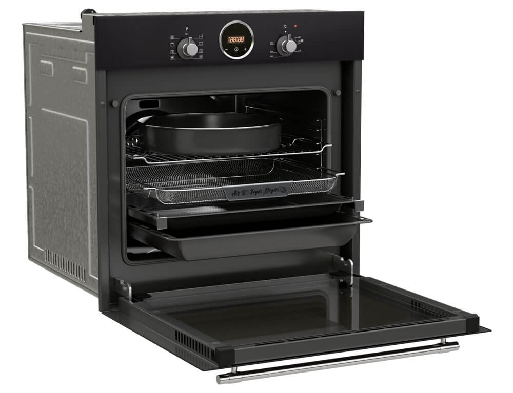 Διαθέτει ένα βαθύ ταψί, ένα ρηχό ταψί, ένα στρογγυλό βαθύ ταψί, μια σχάρα καθώς και ένα airfryer ταψί