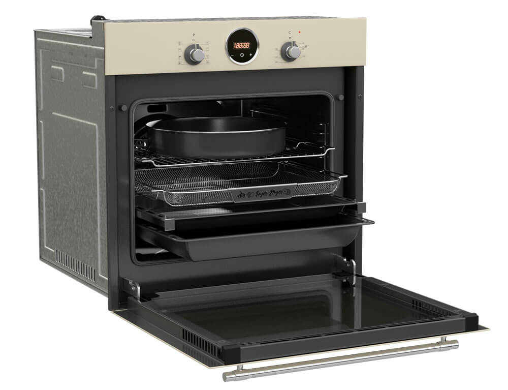 Διαθέτει ένα βαθύ ταψί, ένα ρηχό ταψί, ένα στρογγυλό βαθύ ταψί, μια σχάρα καθώς και ένα airfryer ταψί