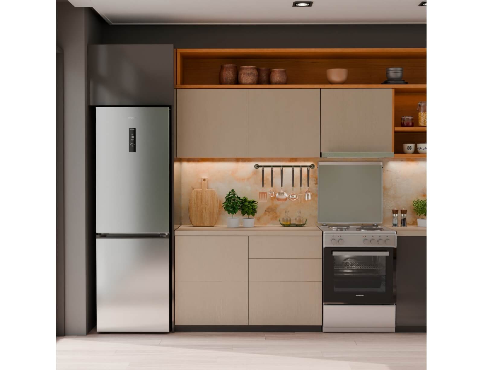 Ψυγειοκαταψύκτης Hyundai HCS24-4060XDG/LF με πρακτικό σχεδιασμό σε ξεχωριστό inox φινίρισμα, μεγάλη χωρητικότητα τροφίμων που φθάνει τα 290 λίτρα και υψηλή απόδοση E για εξοικονόμηση ενέργειας. Επιπλέον διαθέτει τεχνολογία Total No Frost, ρυθμιζόμενα ράφι